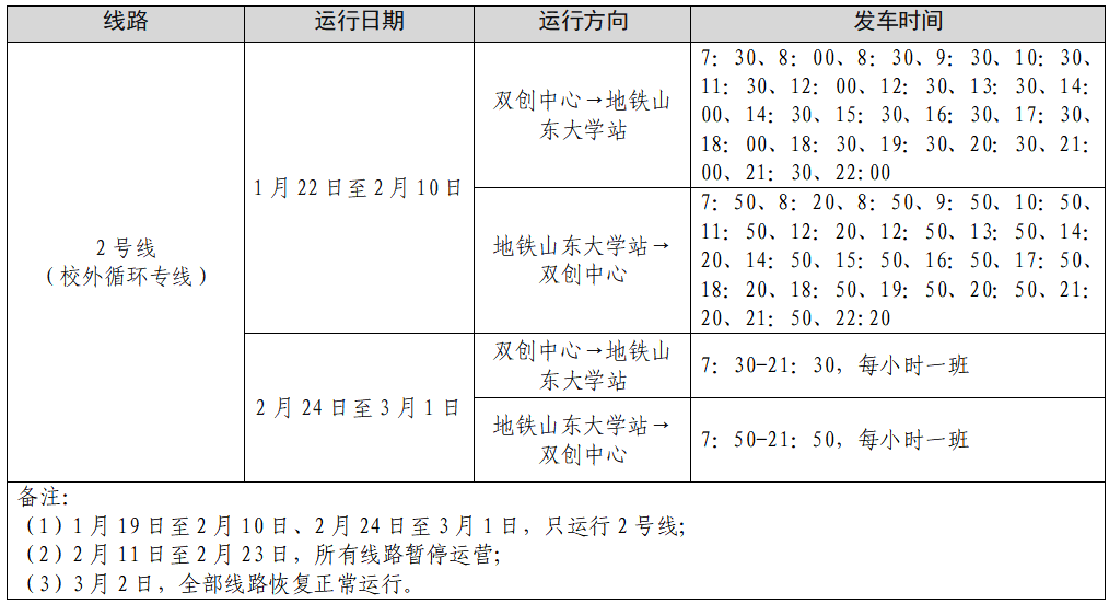 针对近期持续低温及雨雪天气,为保障广大师生的出行便利与安全,确保留校师生科研及生活不受影响,自1月22日至2月10日,对现有校园微公交运行班次进行加密调整。现将运行时间安排通知如下: