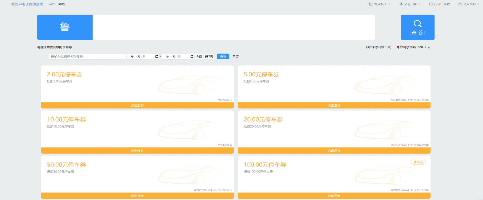 2.各单位电子停车券系统管理员可通过登录系统后的页面查看账户余额(如图2右上角),如果拟发放的停车券面值金额高于账户余额时将无法发券。